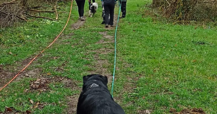 Un petit groupe de 4 chiens, comme on aime, parce qu'on trouve que cela permet aux chiens, qui pour la plupart ne se connaissent pas encore, d'apprendre à communiquer et évoluer progressivement sans trop de stress dû à ce moment tout de même particulier que sont ces balades en groupe, mais aussi pour leurs humains pour qui ma priorité dans cette activité est de les accompagner et de décrire les interactions, tout en les guidant, afin qu'ils puissent par la suite être autonomes et en confiance avec leur toutou!